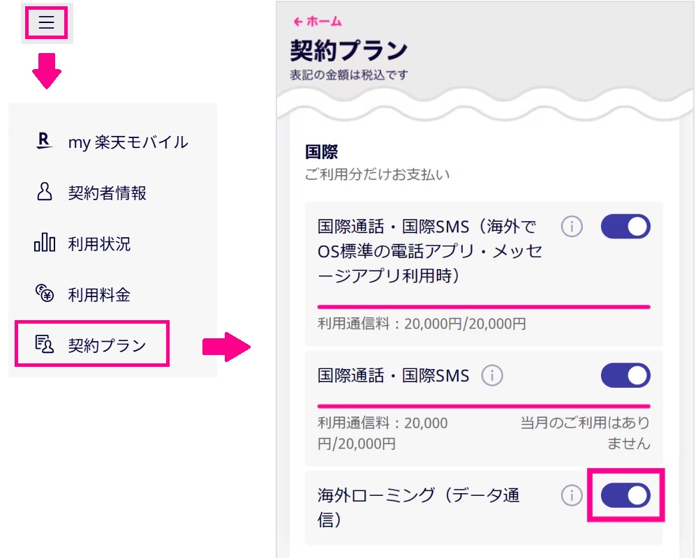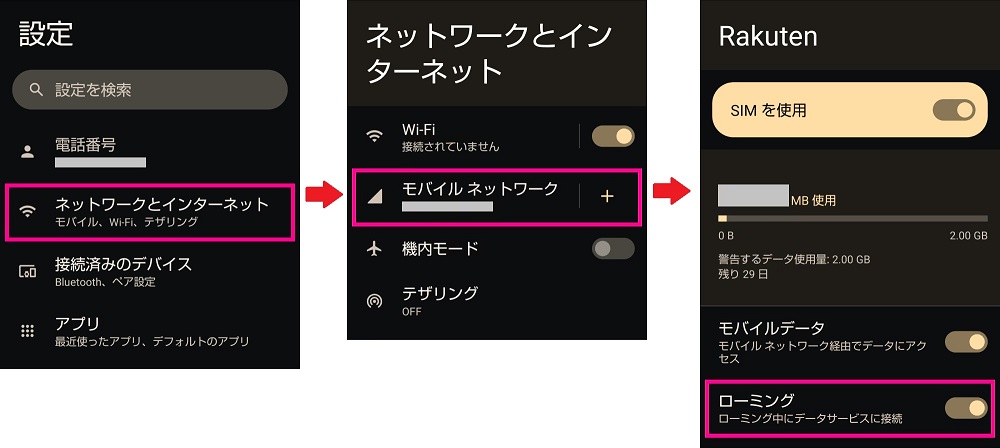 ahamo、楽天モバイル共にスマホのローミング設定が必要です