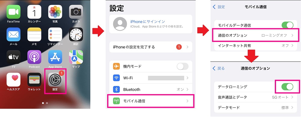 [設定]―[モバイル通信]―[通信オプション]で「データローミング」をONにします