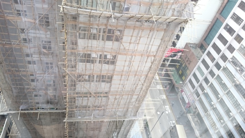 高層ビルの足場を竹で組んでる!